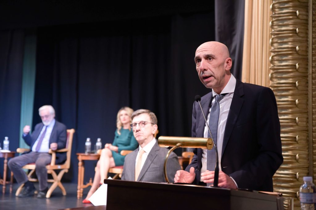Χαιρετισμό απηύθυνε ο υφυπουργός παρά τω πρωθυπουργώ Γιάννης Μπρατάκος, ο οποίος, μεταξύ άλλων, ανέφερε: «Με τη Μικρασιατική Καταστροφή γράφτηκε μία από τις τραγικότερες σελίδες στην ιστορία της Ελλάδας. Με την ανταλλαγή των πληθυσμών, ενάμισι εκατομμύριο Έλληνες πήραν τον δρόμο της εξόδου. Το εγχείρημα της αφομοίωσης ήταν εξαιρετικά δύσκολο, κατ’ αρχήν για τους ίδιους τους πρόσφυγες, αλλά και για την ελληνική κοινωνία. Κι όμως, αυτή η πρόκληση οδήγησε σε ένα από τα σημαντικότερα ειρηνικά επιτεύγματα της σύγχρονης Ελλάδας. Πολύ σύντομα, αυτό που φαινόταν αρχικά ως δυσβάσταχτο φορτίο για την αδύναμη ελληνική οικονομία μετατράπηκε σε προστιθέμενη αξία. Με την αναδιάρθρωση των καλλιεργειών και τον διπλασιασμό της αγροτικής παραγωγής μέσα στην επόμενη δεκαετία. Με την αναζωογόνηση της βιομηχανίας και της βιοτεχνίας, χάρη στην εισροή ειδικευμένου εργατικού δυναμικού, στη διεύρυνση της αγοράς. Αλλά και μέσα από τη δραστηριότητα ανθρώπων με επιχειρηματικό πνεύμα και ικανότητες».