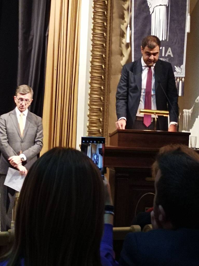 Στη συνέχεια, τον λόγο έλαβε ο γραμματέας της Πολιτικής Επιτροπής της Νέας Δημοκρατίας, Παύλος Μαρινάκης, διαβάζοντας ένα απόσπασμα από ένα βιβλίο που είχε γράψει ο παππούς του: «Δεν ξεριζώθηκαν μονάχα οι Έλληνες της Σμύρνης. Έσβησε και χάθηκε μεθοδευμένα και συστηματικά ό,τι το ελληνικό. Πραγματικά, η Σμύρνη έχει χάσει τη σκιά της. […] Τριγυρίζω, κοντεύει να μεσημεριάσει, προσπαθώντας να βρω μιαν άκρη. Κάποιος Τούρκος με βλέπει να ψάχνω αφοσιωμένος στον χάρτη της πόλης και με πλησιάζει. «Τι θέλετε;» μου λέει, σε άψογα ελληνικά. «Ήταν από εδώ η μάνα μου και προσπαθώ να βρω τη θέση του σπιτιού της, που βρισκόταν μπροστά στην Αγία Φωτεινή». «Δεν υπάρχει πια τίποτα, μόνο πάρκο»».
