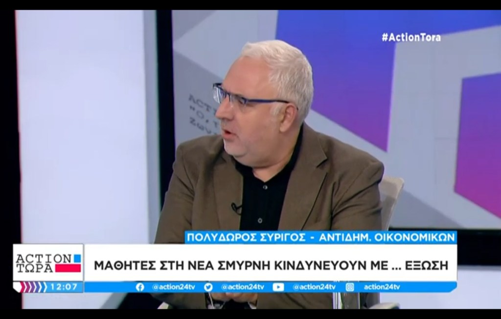 Ο Αντίδημαρχος Οικονομικών του Δήμου Νέας Σμύρνης Πολύδωρος Συρίγος ήταν καλεσμένος στην τηλεοπτική εκπομπή του καναλιού Action 24 «Action Τώρα» που παρουσιάζουν ο Νίκος Υποφάντης και η Μιλένα Ηλιοπούλου. Στην εκπομπή συζητήθηκε το θέμα που έχει προκύψει με τα σχολεία της «Εστίας» (7ο Λύκειο, 8 Γυμνάσιο).