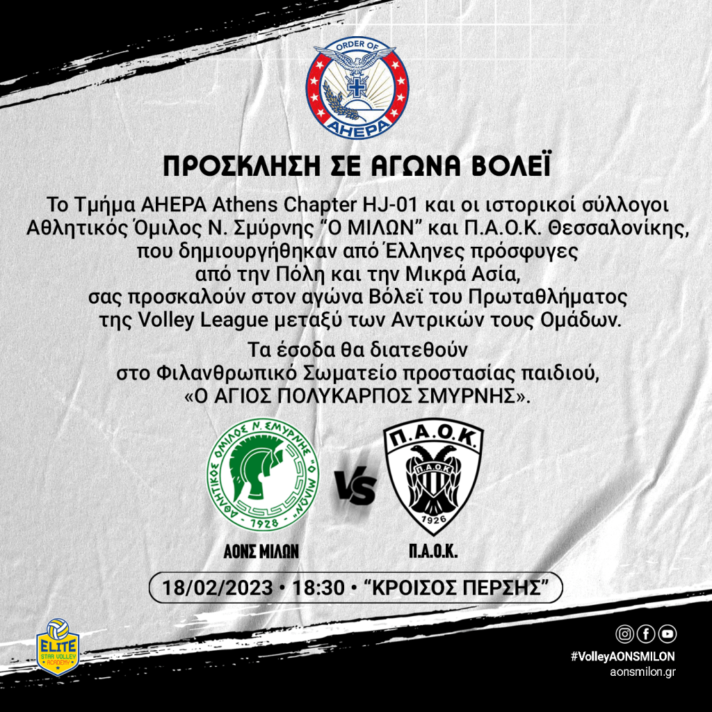 Το Τμήμα AHEPA Athens Chapter HJ-01 και οι ιστορικοί σύλλογοι Αθλητικός Όμιλος Ν. Σμύρνης “Ο ΜΙΛΩΝ” και Π.Α.Ο.Κ. Θεσσαλονίκης, που δημιουργήθηκαν από Έλληνες πρόσφυγες από την Πόλη και την Μικρά Ασία, σας προσκαλούν στον αγώνα Βόλεϊ του Πρωταθλήματος της Volley League μεταξύ των Αντρικών τους Ομάδων, την 18η Φεβρουαρίου 2023 και ώρα 18.30 στο Γήπεδο του Μίλωνα «ΚΡΟΙΣΟΣ ΠΕΡΣΗΣ». (Αδαμάντιου Κοραή & Μεγάλου Βασιλείου, 17122 Νέα Σμύρνη) στο πλαίσιο των εκδηλώσεων μνήμης με την συμπλήρωση 100 χρόνων από την Μικρασιατική Καταστροφή και τους διωγμούς των Ελλήνων από τις εστίες τους.