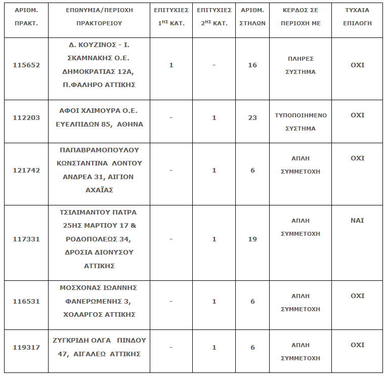 Το τυχερό δελτίο του Τζόκερ παίχτηκε στο πρακτορείο ΟΠΑΠ που βρίσκεται στην οδό Δημοκρατίας 12Α στο Παλαιό Φάληρο. Επίσης βρέθηκαν πέντε νικητές με τυχερά δελτία στη δεύτερη κατηγορία (5αρια), όλοι πλην ενός στην Αττική, καθένας εκ των οποίων κερδίζει το ποσό των 39.818,75 ευρώ.