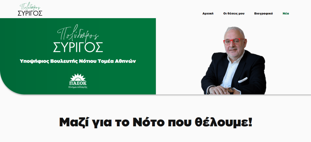Η νέα ιστοσελίδα του Πολύδωρου Συρίγου, υποψήφιου Βουλευτή Νοτίου Τομέα και Αντιδημάρχου Νέας Σμύρνης, είναι εδώ και μερικές ημέρες online. Η ιστοσελίδα βρίσκεται στη διεύθυνση www.polydorossyrigos.gr και σε αυτή μπορείτε να βρείτε πολλές πληροφορίες για τη δράση του κ. Συρίγου, τις θέσεις και τους στόχους του, ενώ παράλληλα μπορείτε να του στείλετε ερωτήσεις και προτάσεις σας.