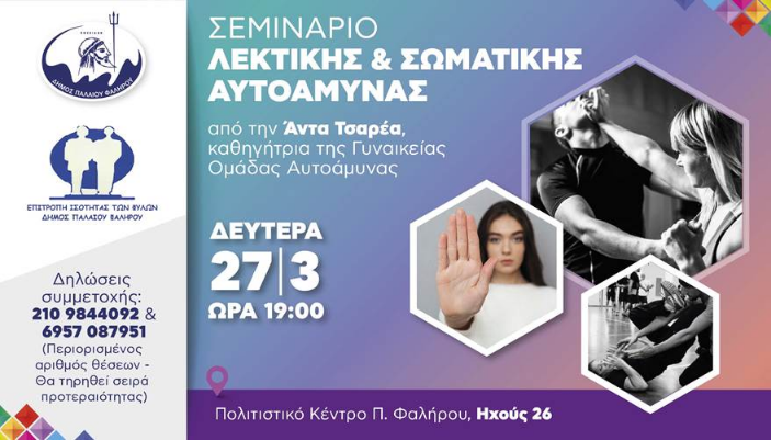 Ο Δήμος Παλαιού Φαλήρου και η Δημοτική Επιτροπή Ισότητας των φύλων, διοργανώνουν «Σεμινάριο Λεκτικής & Σωματικής Αυτοάμυνας» την Δευτέρα 27/3 στις 19.00΄, στο Πολιτιστικό Κέντρο επί της Ηχούς 26.