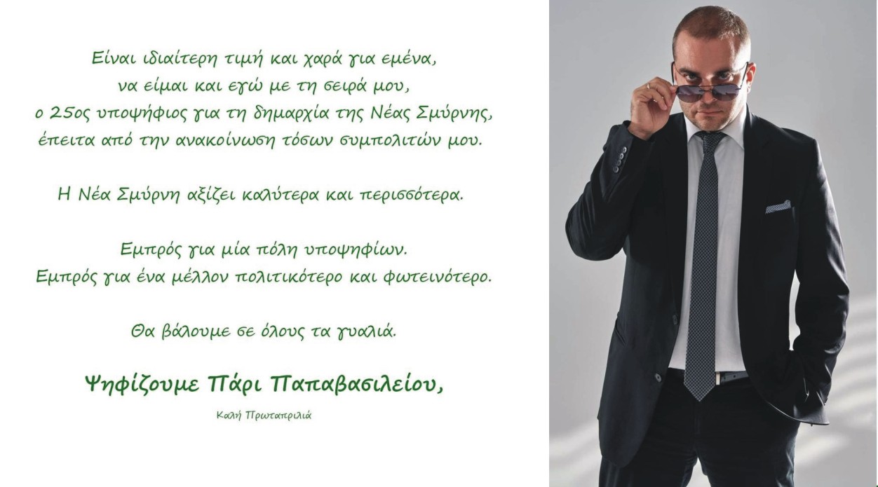Ο γνωστός επιχειρηματίας και ιδιοκτήτης της αλυσίδας οπτικών OCCHIO, Πάρις Παπαβασιλείου, τάραξε τα νερά με μία άκρως επιτυχημένη Πρωταπριλιάτικη ανάρτηση του, στην οποία ανακοίνωσε την υποψηφιότητα του για Δήμαρχος Νέας Σμύρνης.