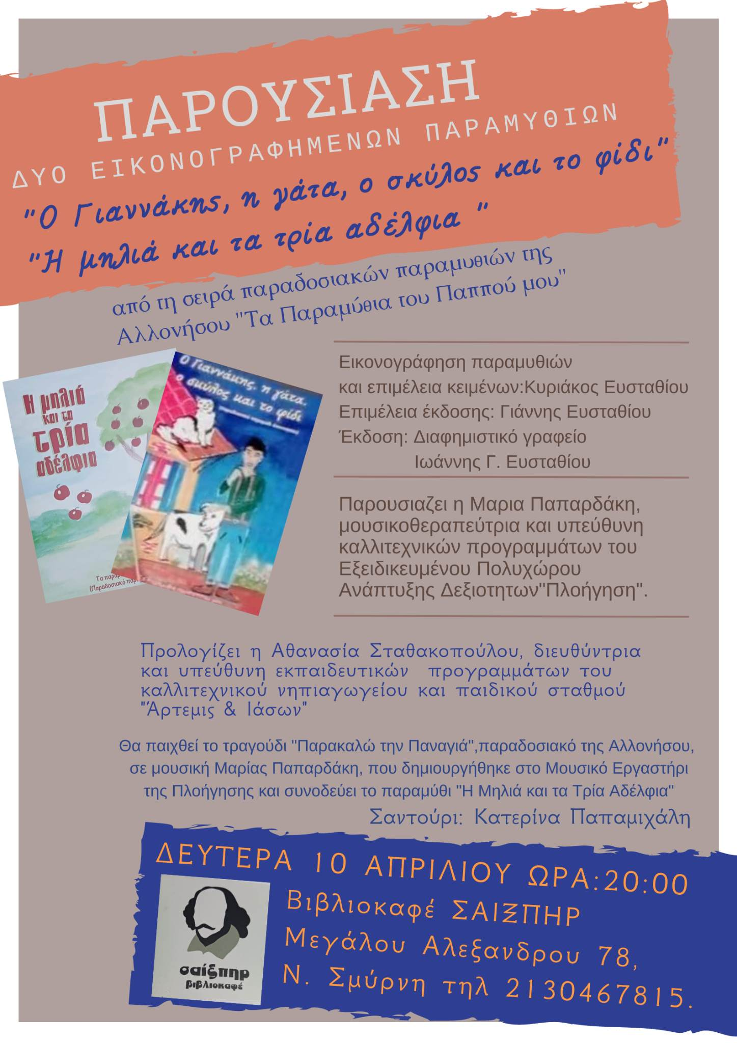Τη Δευτέρα 10 Απριλίου θα πραγματοποιηθεί στη Νέα Σμύρνη, η παρουσίαση δύο εικονογραφημένων παραδοσιακών παραμυθιών που έχει επιμεληθεί ο Κυριάκος Ευσταθίου.