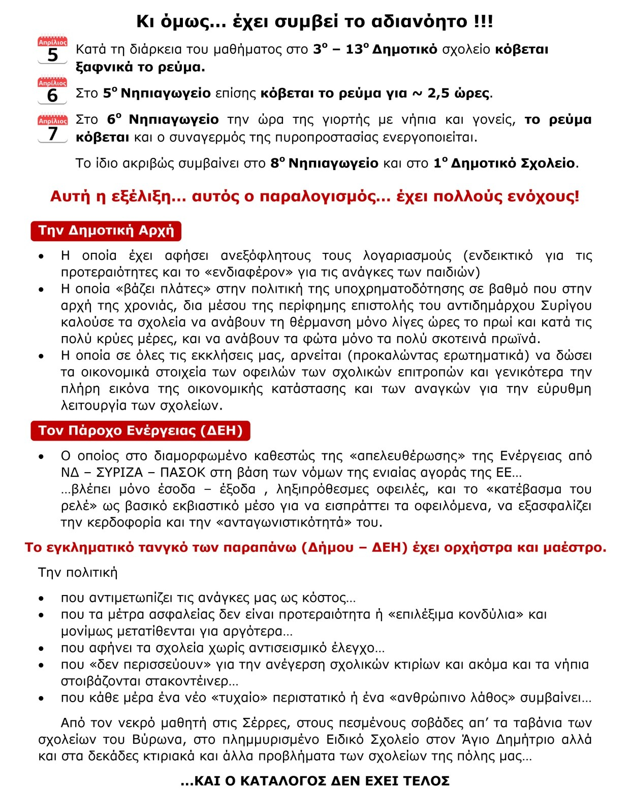 Καλούμε τους Συλλόγους Γονέων να δημοσιοποιούν και να καταγγέλλουν άμεσα οποιοδήποτε πρόβλημα αμέλειας του Δήμου που αφορά την ασφάλεια των παιδιών, όπως πχ η διακοπή ρεύματος που αφήνει τα σχολεία χωρίς δυνατότητα τηλεφωνικής επικοινωνίας.