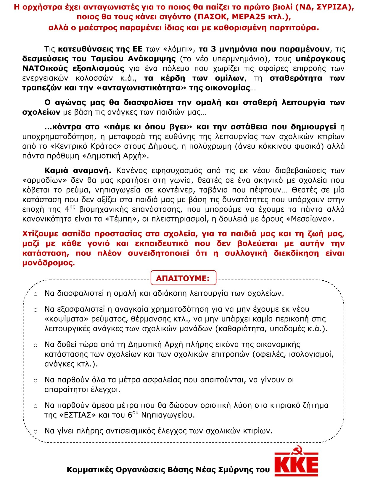 Καλούμε τους γονείς, τους εκπαιδευτικούς, όλους τους εργαζόμενους και τις λαϊκές οικογένειες να οργανώσουν την πάλη τους για: