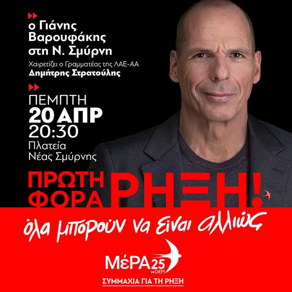 Τη Νέα Σμύρνης επέλεξε ο Γιάνης Βαρουφάκης και το ΜέΡΑ25 – Συμμαχία για τη Ρήξη για να ξεκινήσει την προεκλογική του εκστρατεία του. Την Πέμπτη 20 Απριλίου και ώρα 8.30′ μμ. ο κ. Βαρουφάκης θα μιλήσει στην Κεντρική Πλατεία της Νέας Σμύρνης