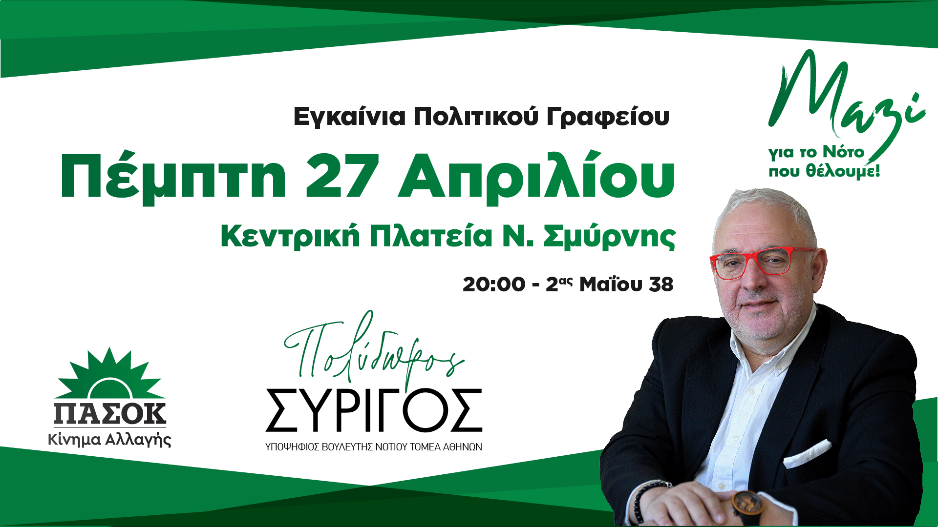 Την Πέμπτη 27 Απριλίου, στις 20:00 το απόγευμα, θα πραγματοποιηθούν τα εγκαίνια του πολιτικού γραφείου του Πολύδωρου Συρίγου στη Νέα Σμύρνη.