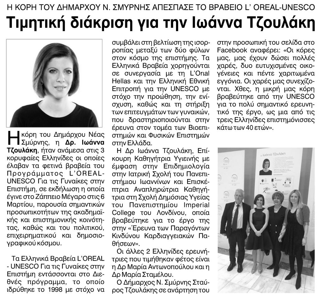 H εφημερίδα μας το 2019 είχε αναφερθεί με άρθρο της στη βράβευση της κ. Τζουλάκη από την Unesco: