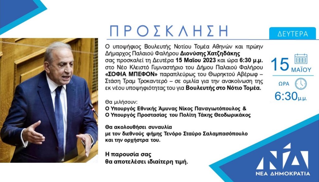 Τη Δευτέρα 15 Μαΐου ο Βουλευτής Νοτίου Τομέα Διονύσης Χατζηδάκης, θα πραγματοποιήσει την κεντρική του ομιλία στο κλειστό γυμναστήριο «Σοφία Μπεφόν» στο Παλαιό Φάληρο. Η εκδήλωση θα ξεκινήσει στις 18:30 το απόγευμα.