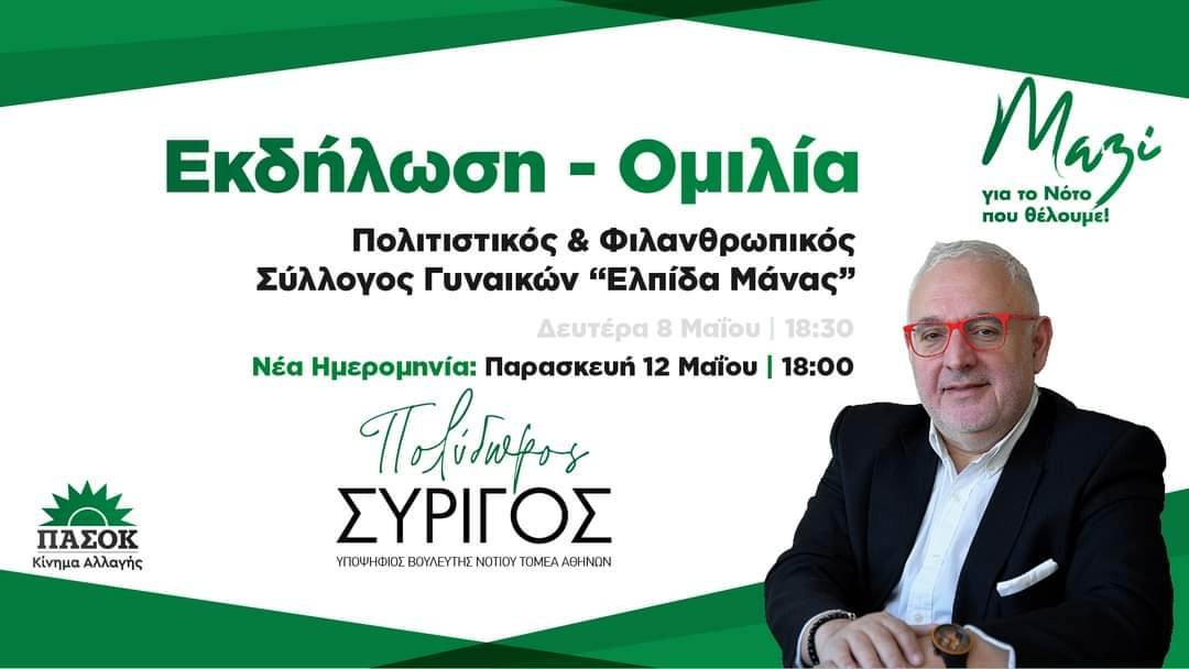 Ο υποψήφιος Βουλευτής Πολύδωρος Συρίγος, είχε προγραμματίσει να πραγματοποιήσει εκδήλωση – ομιλία στον Πολιτιστικό & Φιλανθρωπικό Σύλλογο Γυναικών «Ελπίδα Μάνας» (Ξενοφώντος 85-87 Καλλιθέα) τη Δευτέρα 8 Μαΐου το απόγευμα,όπου θα συζητούσε και θα αντάλλαζε απόψεις με τους πολίτες της Καλλιθέας.