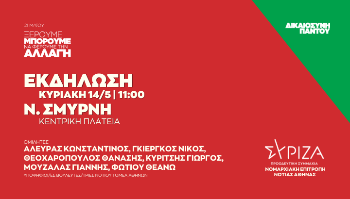 Η Νομαρχιακή Επιτροπή ΝότιαςΑθήνας ΣΥΡΙΖΑ – ΠΣ σας προσκαλεί σε ανοιχτή πολιτική εκδήλωση την, Κυριακή 14/5 και ώρα 11.00στην Κεντρική Πλατεία Νέας Σμύρνης