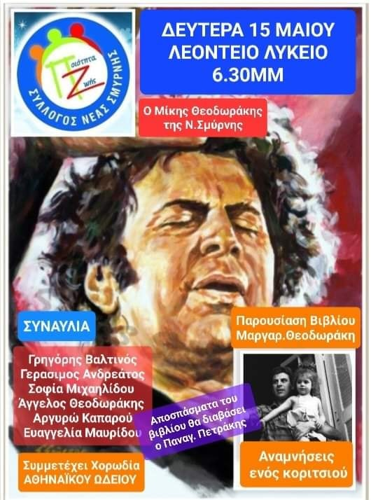 Τη Δευτέρα 15 Μαΐου ο σύλλογος «Ποιότητα Ζωής» διοργανώνει αφιερωματική εκδήλωση για τον Μίκη Θεοδωράκη, η οποία θα πραγματοποιηθεί στο Μεγάλο Αμφιθέατρο της Λεοντείου Σχολής Νέας Σμύρνης στις 18:30 το απόγευμα.