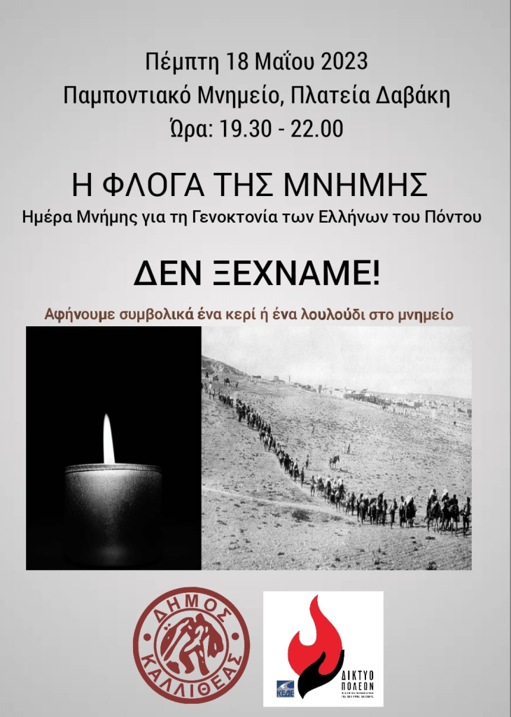 Ο Δήμος Καλλιθέας ανάβει την «ΦΛΟΓΑ ΤΗΣ ΜΝΗΜΗΣ», και καλεί την Πέμπτη 18 Μαΐου 2023, στις 19.30, στο Παμποντιακό Μνημείο, στην Πλατεία Δαβάκη, όλους τους πολίτεςκαι τους συλλογικούς φορείς να δώσουν το «παρών» στην εκδήλωση για την Ημέρα Μνήμης της Γενοκτονίας των Ελλήνων του Πόντου, σε συνεργασία με το «Δίκτυο Πόλεων με κοινότητες απογόνων Ελλήνων της καθ΄ ημάς Ανατολής» της ΚΕΔΕ.