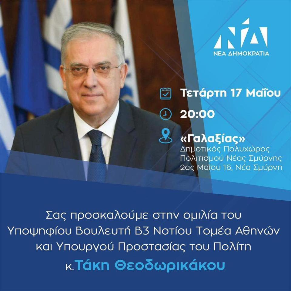 Ο Υπουργός Προστασίας του Πολίτη και Υποψήφιος Βουλευτής Β3 Νοτίου Τομέα, Τάκης Θεοδωρικάκος, θα μιλήσει την Τετάρτη 17 Μαΐου στον Πολυχώρο «Γαλαξίας» στην Κεντρική Πλατεία Νέας Σμύρνης.