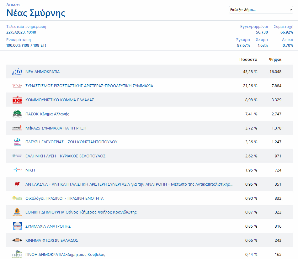 ΚΚΕ και ΠΑΣΟΚ ανέβασαν τα ποσοστά τους, με το ΚΚΕ να διατηρεί την 3η θέση στη Νέα Σμύρνη για μία ακόμα εκλογική αναμέτρηση. Το ΚΚΕ πήρε 8,98% έναντι 6,40% του 2019 και το ΠΑΣΟΚ 7,41% έναντι 5,52% του 2019.