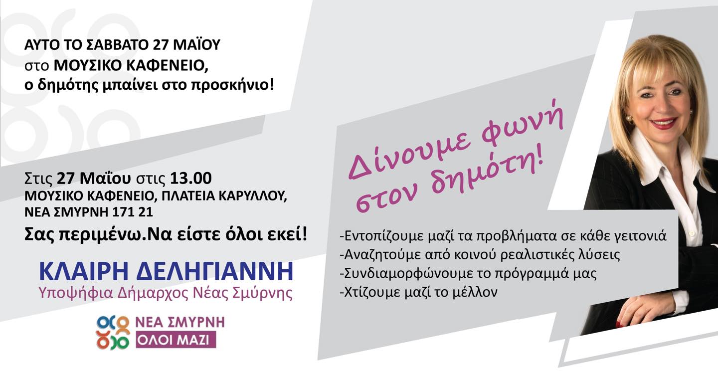 Η υποψήφια Δήμαρχος Νέας Σμύρνης Κλαίρη Δεληγιάννη, καλεί το Σάββατο 27 Μαΐου τους δημότες σε μία ανοιχτή συζήτηση για θέματα της πόλης. Όπως μας ενημέρωσαν στελέχη της παράταξης της, θα ακολουθήσουν προσεχώς και άλλα παρόμοια καλέσματα σε διάφορες γειτονιές της Νέας Σμύρνης.
