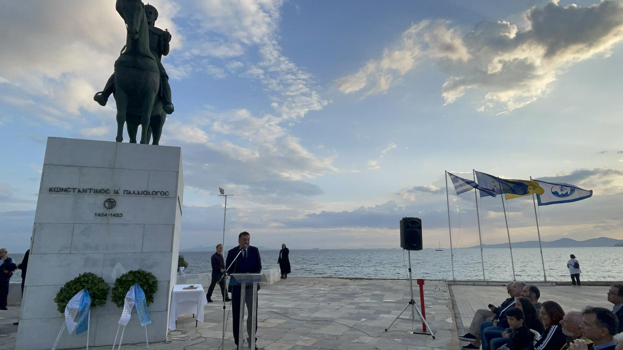 Την εκδήλωση τίμησε όπως κάθε χρόνο με την παρουσία και τον χαιρετισμό του, ο Ομότιμος Καθηγητής Νικόλαος Ουζούνογλου, Πρόεδρος της ΟΙΟΜΚΩ, ο οποίος στην ομιλία του αναφέρθηκε σε ιστορικές λεπτομέρειες του σημαντικού ιστορικού για τον Ελληνισμό γεγονότος και τόνισε ιδιαίτερα την αξία και την σημασία της απόφασης της Δημοτικής Αρχής Διονύση Χατζηδάκη για την τοποθέτηση του ανδριάντα του Κωνσταντίνου ΙΑ΄ Παλαιολόγου στο συγκεκριμένο σημείο.