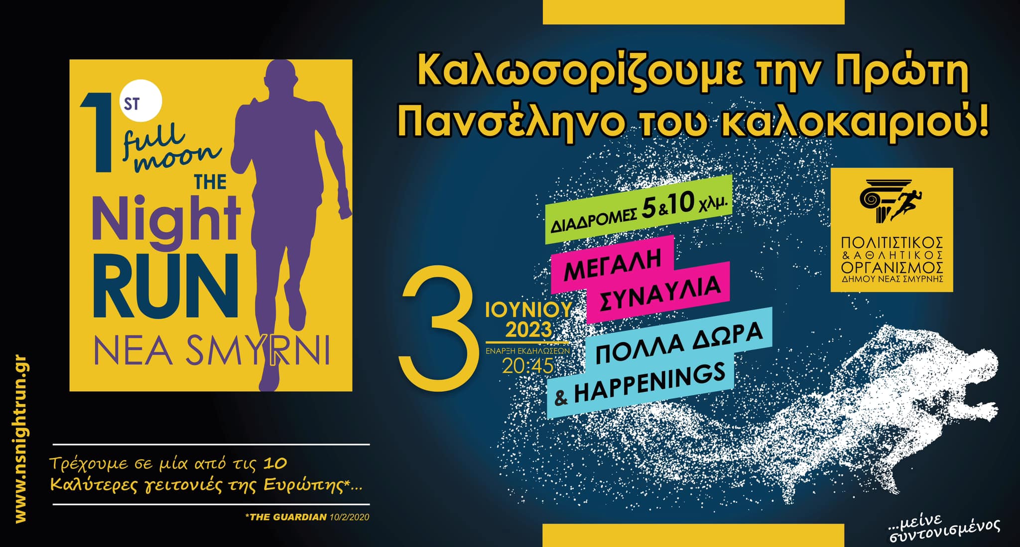 Όπως ανακοινώθηκε από την ΕΛ.ΑΣ, λόγω διεξαγωγής αγώνα δρόμου με την επωνυμία «1ος Ιστορικός Νυχτερινός Αγώνας Δρόμου Νέας Σμύρνης» το Σάββατο 3-6-2023 και κατά τις ώρες 19:00΄ έως 23:30΄, θα πραγματοποιηθεί προσωρινή και σταδιακή διακοπή της κυκλοφορίας των οχημάτων επί της Λεωφόρου Ελευθερίου Βενιζέλου, στο τμήμα της μεταξύ των οδών Εφέσου και Αχιλλέως και στα δύο ρεύματα κυκλοφορίας, καθώς και στις καθέτους αυτής έως την πρώτη παράλληλη οδό, περιοχής Δήμου Νέας Σμύρνης.