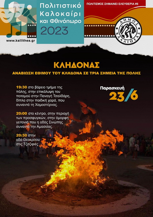 Ο Δήμος Καλλιθέας και φέτος αναβιώνει το παραδοσιακό έθιμο του Κλήδονα, σε τρία γραφικά σημεία της πόλης, την Παρασκευή 23 Ιουνίου 2023.