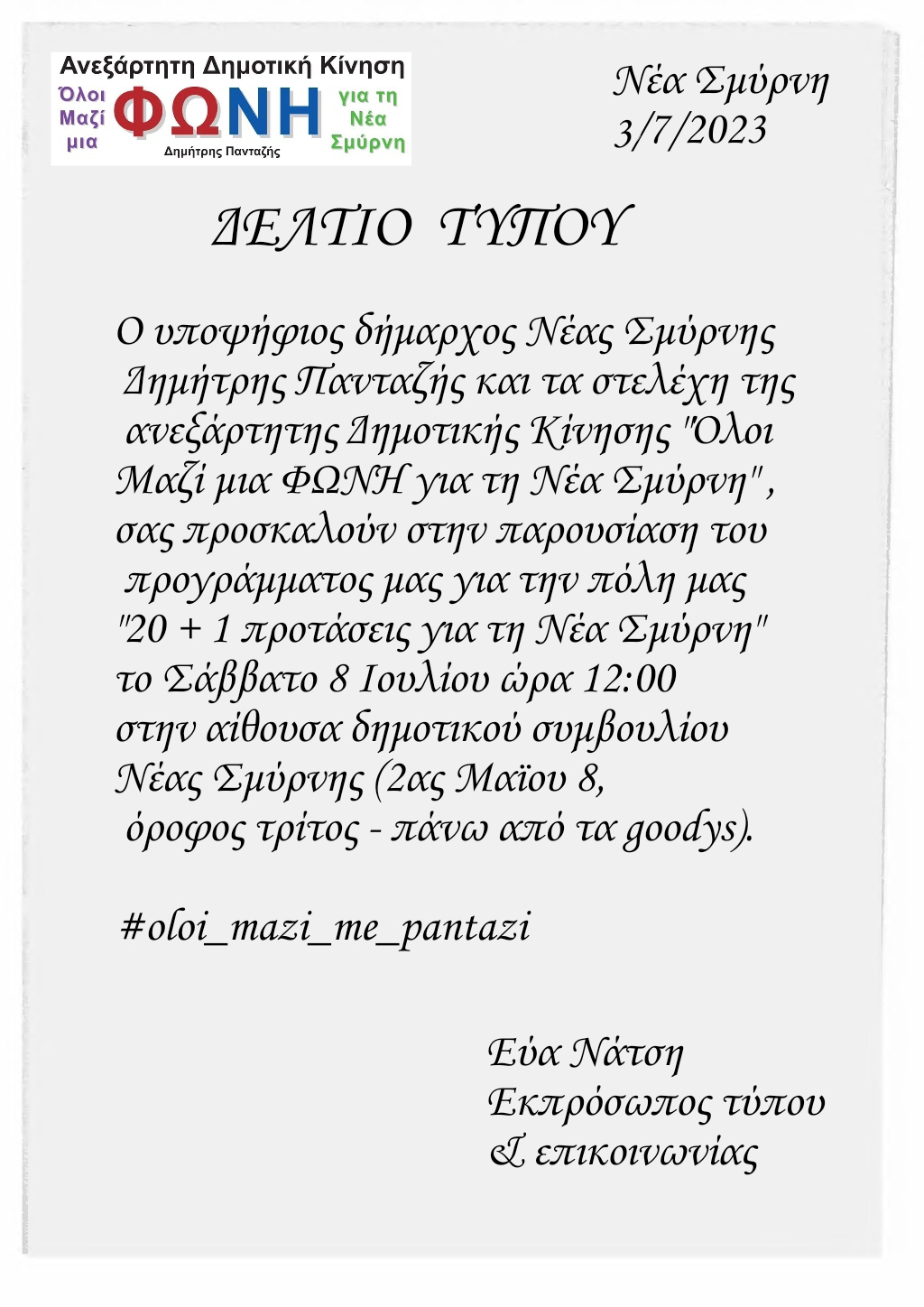 Σε εκδήλωση η οποία θα γίνει το Σάββατο 8 Ιουλίου το μεσημέρι, ο υποψήφιος Δήμαρχος Δημήτρης Πανταζής, θα παρουσιάσει αναλυτικά το πρόγραμμα του συνδυασμού του «Όλοι μαζί μία Φωνή για τη Νέα Σμύρνη».