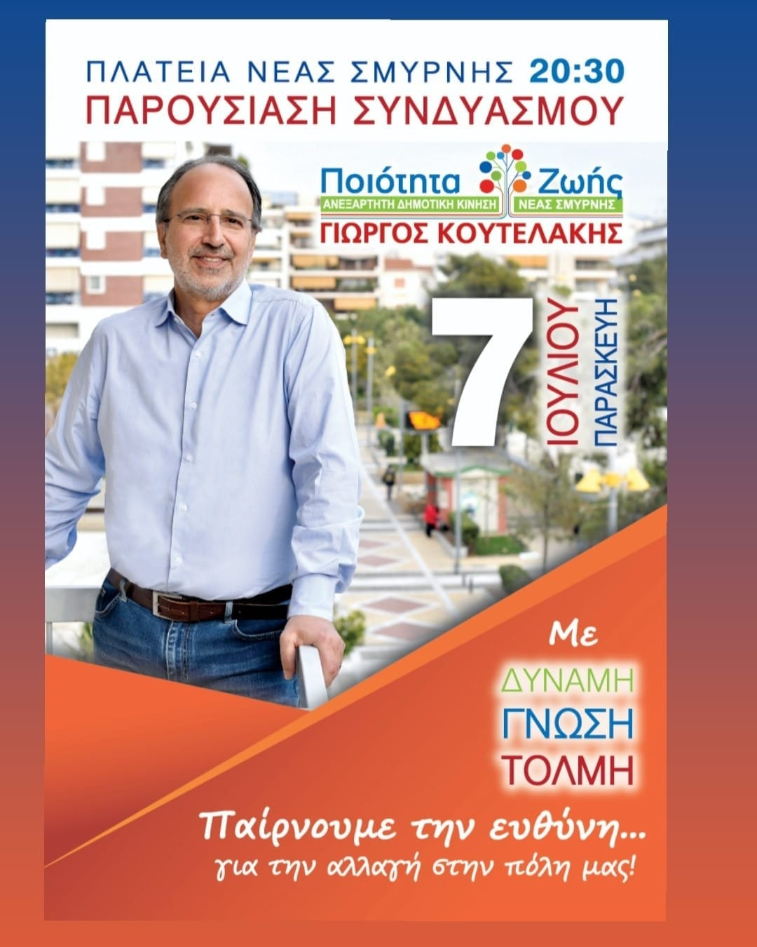 Την Παρασκευή 7 Ιουλίου θα πραγματοποιηθεί η πρώτη επίσημη προεκλογική συγκέντρωση του συνδυασμού «Νέα Σμύρνη – Ποιότητα Ζωής» του υποψηφίου Δημάρχου Γιώργου Κουτελάκη.