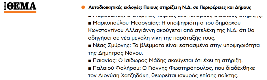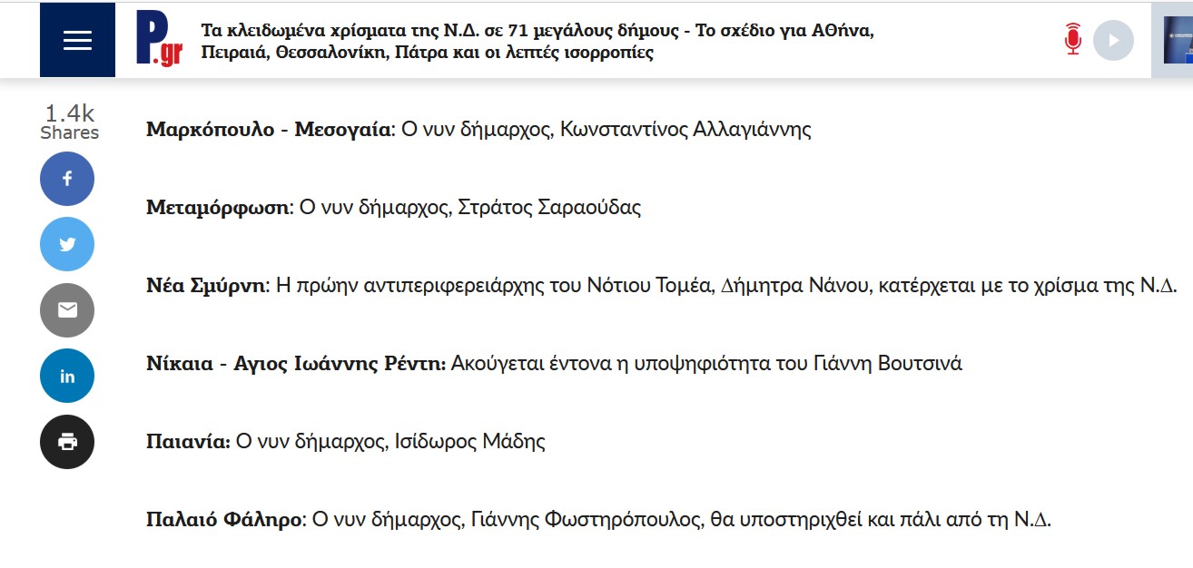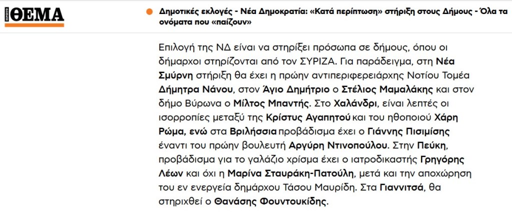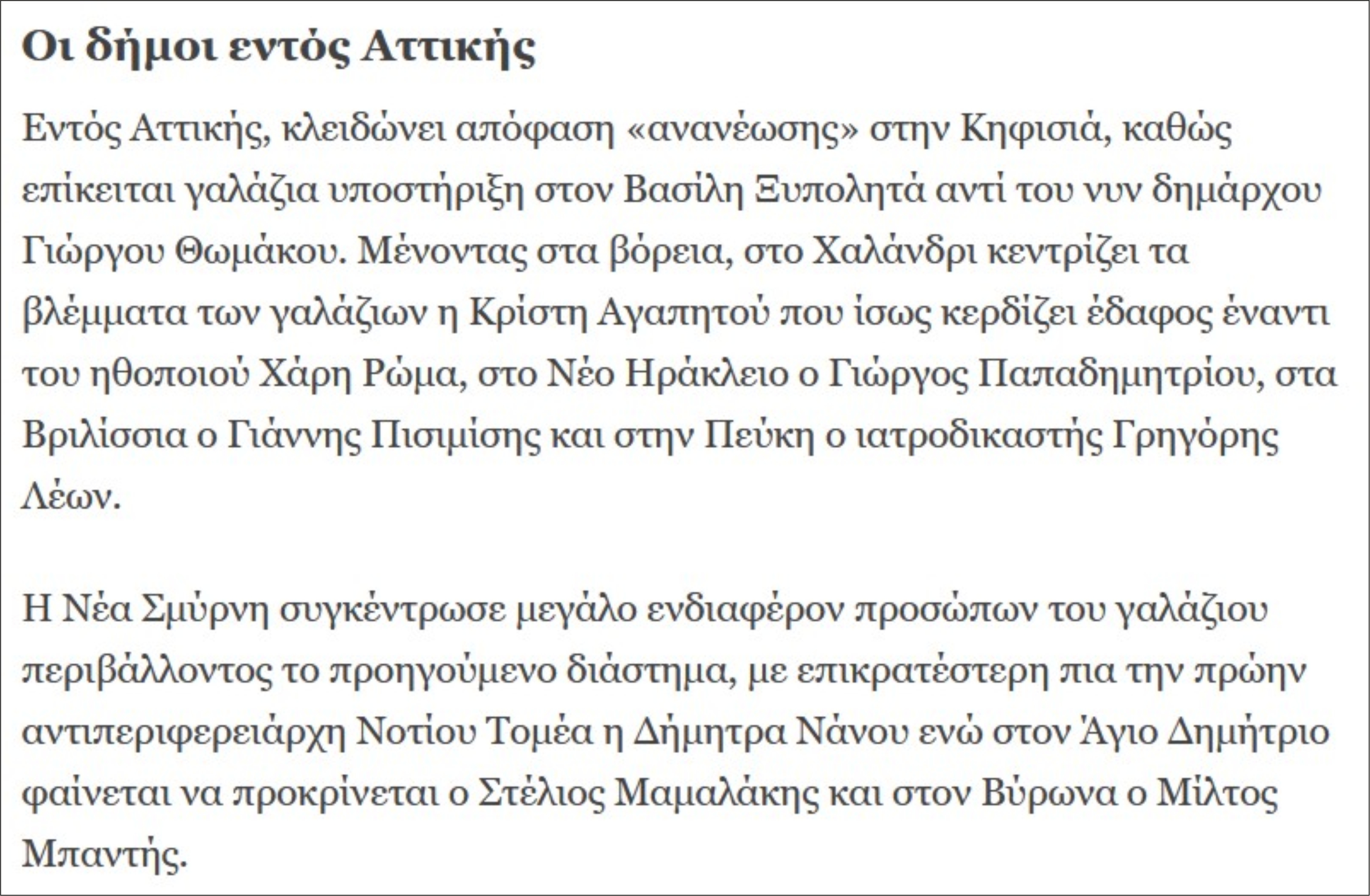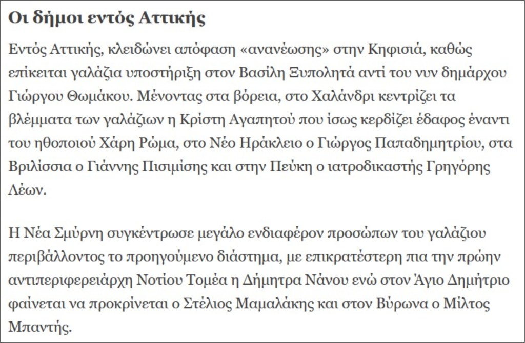 Τέλος το in.gr κάνει ειδική αναφορά στη Νέα Σμύρνη, τονίζοντας το «γαλάζιο» ενδιαφέρον που υπάρχει στον Δήμο και θεωρώντας πλέον ως επικρατέστερη τη Δήμητρα Νάνου.