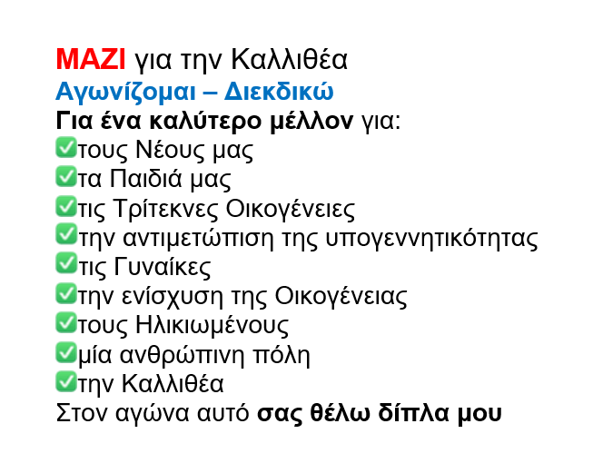 Μαζί με όλα τα μέλη του Συλλόγου Τριτέκνων, δέχθηκε την πρόταση του Δημήτρη Κάρναβου, για να είναι υποψήφια στις Δημοτικές εκλογές, έτσι ώστε μέσα από τον Δήμο να διεκδικήσει και να πετύχει περισσότερα, για τα παιδιά, τους γονείς, τις οικογένειες, της πόλης που κατοικεί.