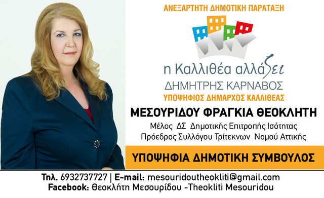 Η Θεοκλήτη Μεσουρίδου με σπουδές στη Διοίκηση Τουριστικών Μονάδων και στη Δημοσιογραφία, Ιδρυτικό Μέλος και Πρόεδρος του Συλλόγου Τριτέκνων Νομού Αττικής, θέτει υποψηφιότητα ως δημοτικός σύμβουλος στην παράταξη του Δημάρχου Δημήτρη Κάρναβου.