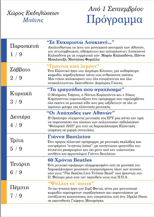 Η 1η Σεπτεμβρίου 2023 αποτελεί ημερομηνία-ορόσημο για τον κορυφαίο πολιτιστικό θεσμό του Δήμου Παλαιού Φαλήρου καθώς έχει συνδεθεί με την έναρξη των ΦΑΛΗΡΙΚΩΝ, στην παραλία του Μπάτη, σε ένα από τα ξεχωριστά, αγαπητά στους πολίτες, παραλιακά τοπόσημα της πόλης.