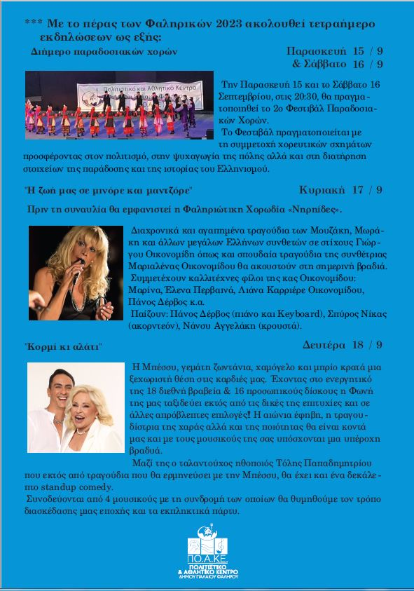 Για πρώτη φορά εφέτος, μετά τον κύκλο των Φαληρικών (1/9 έως 14/9) και από 15/9 έως και 18/9 έχει προγραμματισθεί και οργανωθεί τετραήμερο εκδηλώσεων από το Πολιτιστικό Αθλητικό Κέντρο, οι οποίες διευρύνουν και εμπλουτίζουν το πρόγραμμα της διοργάνωσης