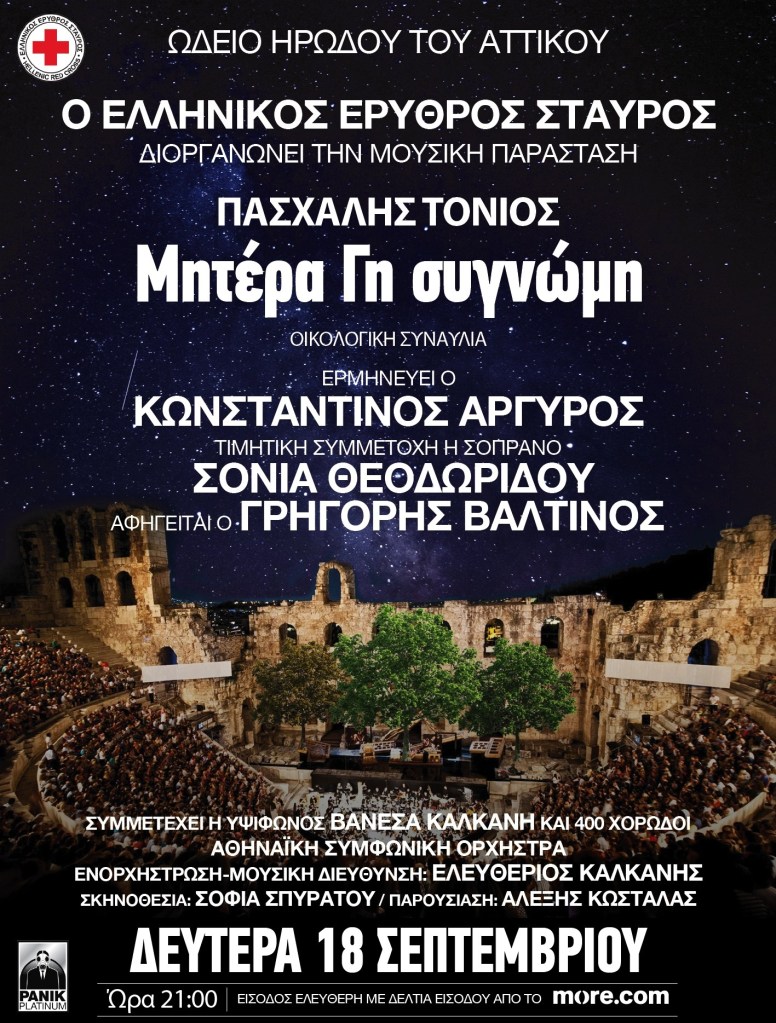 Ο Ελληνικός Ερυθρός Σταυρός παρουσιάζει μια μεγάλη συναυλία για το περιβάλλον και την κλιματική αλλαγή, την Δευτέρα 18 Σεπτεμβρίου στο Ηρώδειο, με το έργο του συνθέτη Πασχάλη Τόνιου «Μητέρα Γη Συγνώμη»