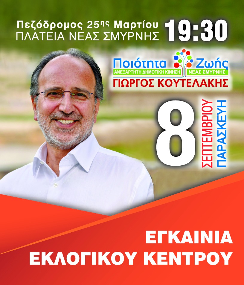 Την Παρασκευή 8 Σεπτεμβρίου και ώρα 19:30 θα πραγματοποιηθούν τα εγκαίνια του εκλογικού κέντρου του υποψηφίου Δημάρχου Ν. Σμύρνης Γιώργου Κουτελάκη. Το εκλογικό κέντρο βρίσκεται επί της κεντρικής Πλατείας.