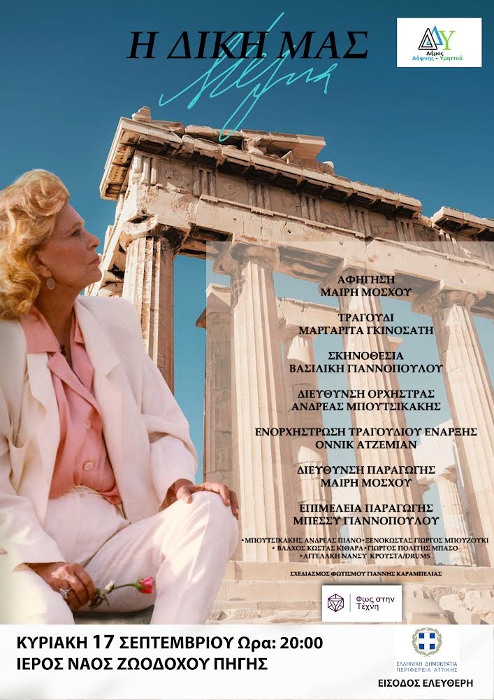 Ο Δήμος Δάφνης – Υμηττού τιμώντας τη Μελίνα Μερκούρη, της οποίας το όνομα φέρει ένα εκ των δύο εμβληματικών Θεάτρων Βράχων στον Λόφο Κοπανά στην πόλη μας, φιλοξενεί τη μουσικοθεατρική παράσταση «Η δική μας Μελίνα», αφιερωμένη στη γυναίκα που «αγκάλιασε» τον πολιτισμό και στον Δήμο μας.