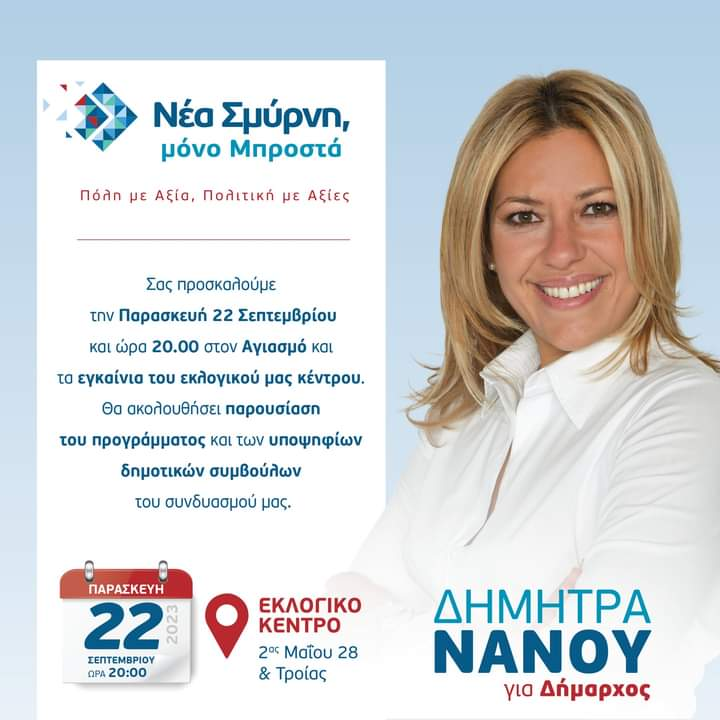 ΝΕΑ ΣΜΥΡΝΗ: Την Παρασκευή 22/9 τα εγκαίνια του εκλογικού κέντρου της Δήμητρας Νάνου
