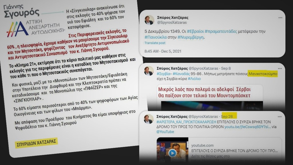 Σε δήλωσή του ο Σπύρος Χατζάρας ανέφερε πως είναι «αντι-μητσοτακικός» και όχι «αντισημίτης» και κάνει λόγο για «πολιτικό υπόκοσμο της προδοσίας, της εξάρτησής και της υποτέλειας», που «τρέμει την ανασυγκρότηση του παλλαϊκού κινήματος και τη διογκούμενη λαϊκή συσπείρωση γύρω από τον Γιάννη Σγουρό».