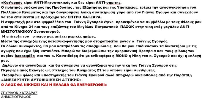 «1. Οι αναρτήσεις και τα δημοσιεύματα που αποδίδονται στον Σπύρο Χατζάρα μας βρίσκουν απόλυτα και ριζικά αντίθετους και γι’ αυτό τις καταδικάζουμε με τον πιο ρητό και κατηγορηματικό τρόπο.»1. Οι αναρτήσεις και τα δημοσιεύματα που αποδίδονται στον Σπύρο Χατζάρα μας βρίσκουν απόλυτα και ριζικά αντίθετους και γι’ αυτό τις καταδικάζουμε με τον πιο ρητό και κατηγορηματικό τρόπο.
