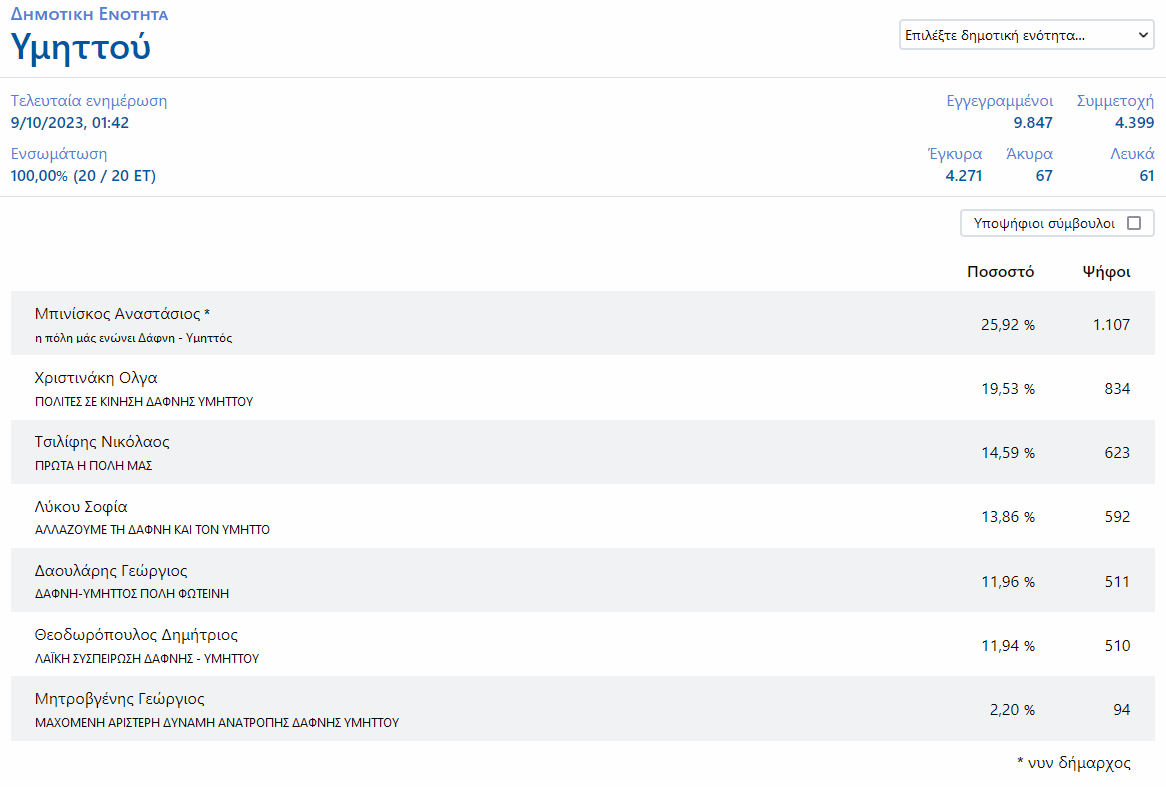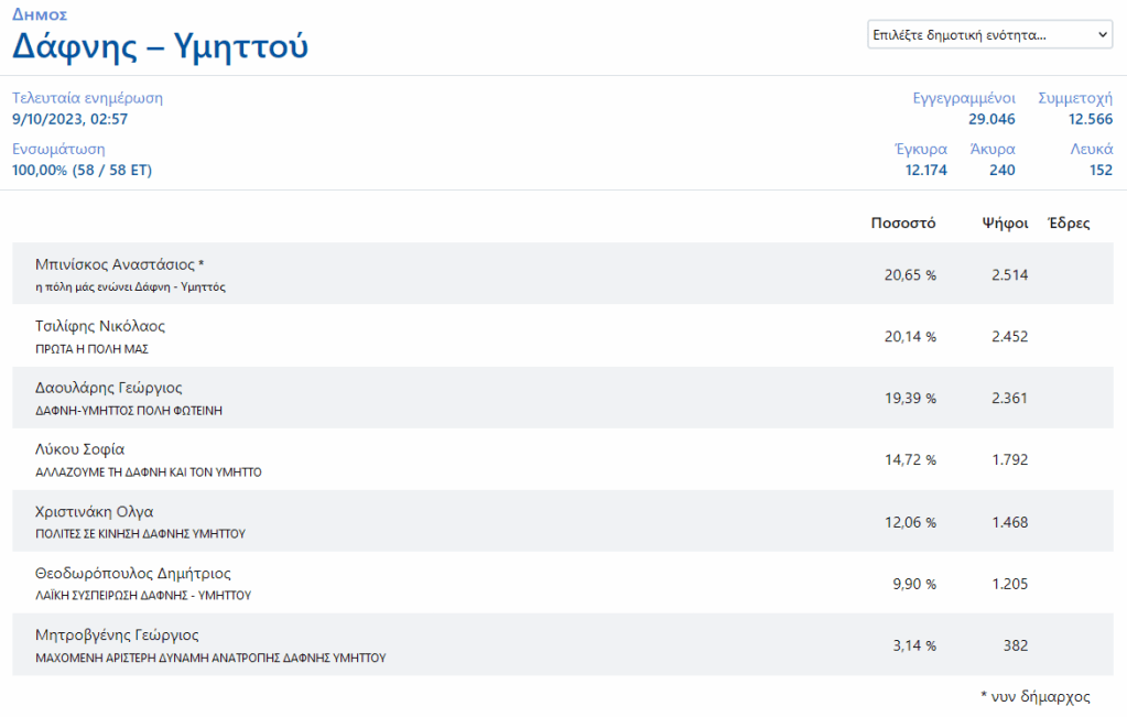 Ο Υμηττός ουσιαστικά έδωσε τη νίκη στον Τάσο Μπινίσκο, αφού εκεί ο Δήμαρχος βγήκε πρώτος με μεγάλη διαφορά από τους Τσιλίφη και Δαουλάρη. Ο Υμηττός από την άλλη, κόστισε στον Γιώργο Δαουλάρη την είσοδο του στο Β’ γύρο και ίσως την πρώτη θέση, αφού κέρδισε μεν το Δήμο Δάφνης, αλλά καταποντίστηκε στον Υμηττό βγαίνοντας 5ος με μόλις 11,6%.