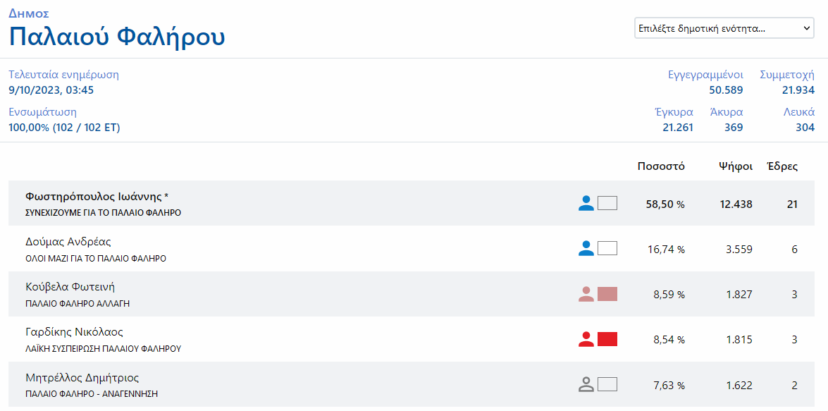 Ο Δήμαρχος Γιάννης Φωστηρόπουλος επανεκλέχθηκε, όπως έδειχναν όλα τα προγνωστικά και μάλιστα με συντριπτική διαφορά 42 μονάδων από τον δεύτερο Ανδρέα Δούμα. Το 58,5% που έλαβε, δείχνει την μεγάλη αποδοχή που έχει από τους δημότες του Παλαιού Φαλήρου.