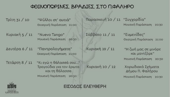 Ο Δήμαρχος Παλαιού Φαλήρου Γιάννης Φωστηρόπουλος σημειώνει για τον κύκλο των «ΦΘΙΝΟΠΩΡΙΝΩΝ ΒΡΑΔΙΩΝ» που θα παρουσιασθεί: «Αφού ως κοινωνία ξεπεράσαμε όλοι μαζί την πρωτόγνωρη για την χώρα μας φυσική καταστροφή της Θεσσαλίας και επιδείξαμε για ακόμα μία φορά κοινωνική ευαισθησία και αλληλεγγύη, συνεχίζουμε από 31 Οκτωβρίου, με τον Κύκλο εκδηλώσεων των ‘ΦΘΙΝΟΠΩΡΙΝΩΝ ΒΡΑΔΙΩΝ’ με στόχο η αισιοδοξία και το χαμόγελο να επιστρέψουν ξανά. Ας απολαύσουμε όλοι, αυτόν τον προσεγμένο Κύκλο εκδηλώσεων, που τόσο μας έλειψε το προηγούμενο διάστημα. Ευχαριστώ θερμά το ΠΟ.Α.ΚΕ, το Δ.Σ. και τα μέλη του, τους υπαλλήλους και τους εθελοντές μας».