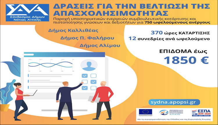 Με επιτυχία ολοκληρώθηκαν όλες οι ενέργειες Συμβουλευτικής, Κατάρτισης και Πιστοποίησης του έργου με τίτλο «Δράσεις για τη Βελτίωση της Απασχολησιμότητας», με κωδικό ΟΠΣ 5055289, το οποίο υλοποιήθηκε από τον Δικαιούχο Σύνδεσμο Δήμων Νότιας Αττικής (Συ.Δ.Ν.Α.) στο πλαίσιο του Επιχειρησιακού Προγράμματος «ΠΕΠ «ΑΤΤΙΚΗ» 2014-2020», σε συνεργασία με τους Δήμους Αλίμου, Καλλιθέας και Π. Φαλήρου.