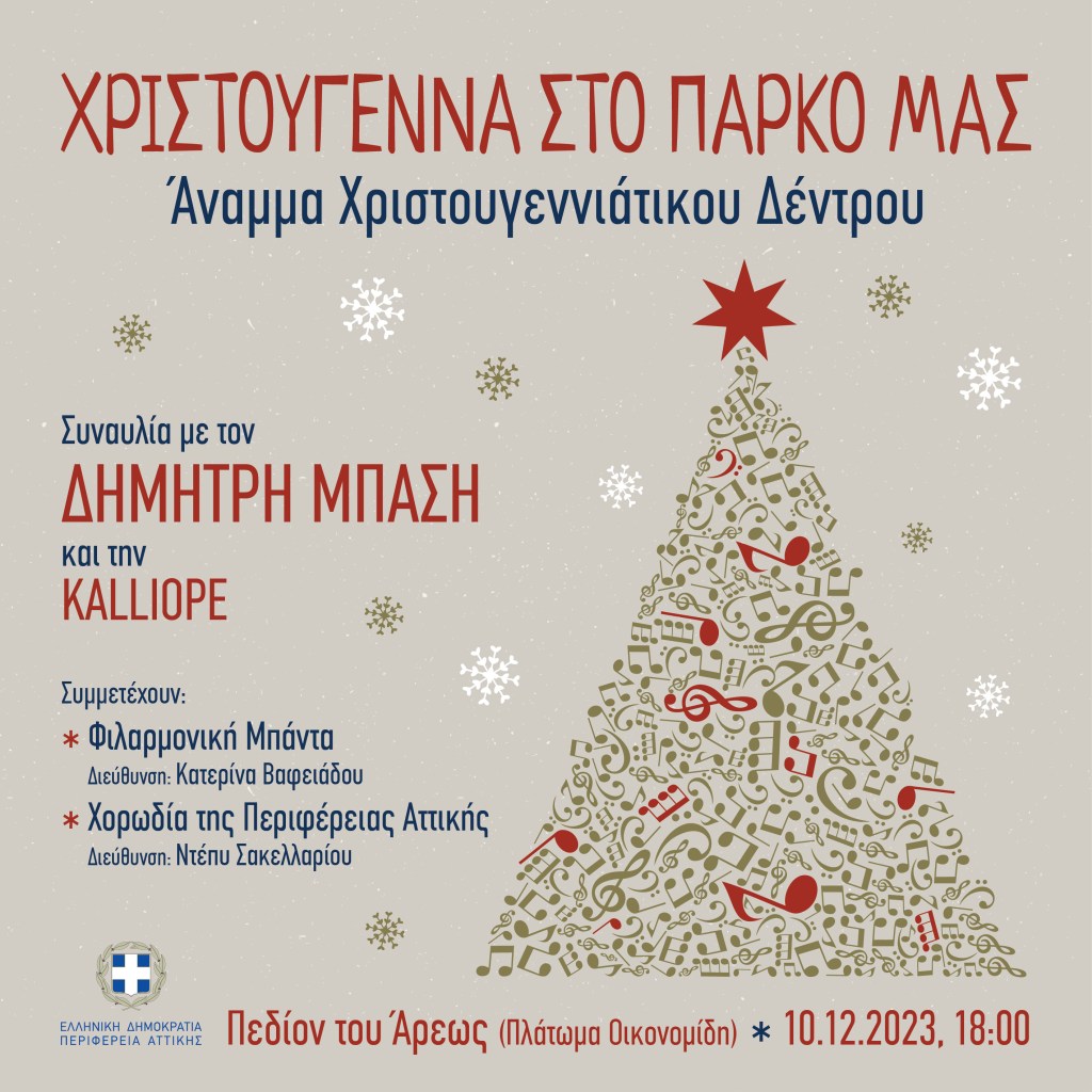 Το ραντεβού δίνεται στο πλάτωμα Οικονομίδη, ενώ μετά τη γιορτινή φωταγώγηση και τις χριστουγεννιάτικες μελωδίες από τη Φιλαρμονική Μπάντα υπό τη Διεύθυνση της Κατερίνας Βαφειάδου και τη Χορωδία της Περιφέρειας Αττικής υπό τη διεύθυνση της Ντέπυς Σακελλαρίου, θα ακολουθήσει μια μοναδική συναυλία με τον αγαπημένο Δημήτρη Μπάση σ’ ένα εορταστικό πρόγραμμα -έκπληξη!