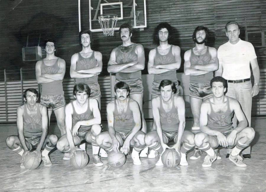 Ο Λάκης Τσικίμης, τρίτος από αριστερά στην επάνω σειρά, στην ομάδα μπάσκετ του Πανιωνίου τη σεζόν 1976-77