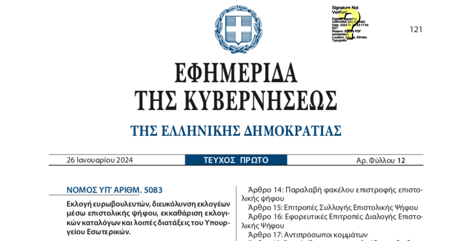 Δημοσιεύθηκε, σε ΦΕΚ Α’ 12/26-01-2024 ο Νόμος 5056/2024, με θέμα την “Εκλογή ευρωβουλευτών, διευκόλυνση εκλογέων μέσω επιστολικής ψήφου, εκκαθάριση εκλογικών καταλόγων και λοιπές διατάξεις του Υπουργείου Εσωτερικών.”.