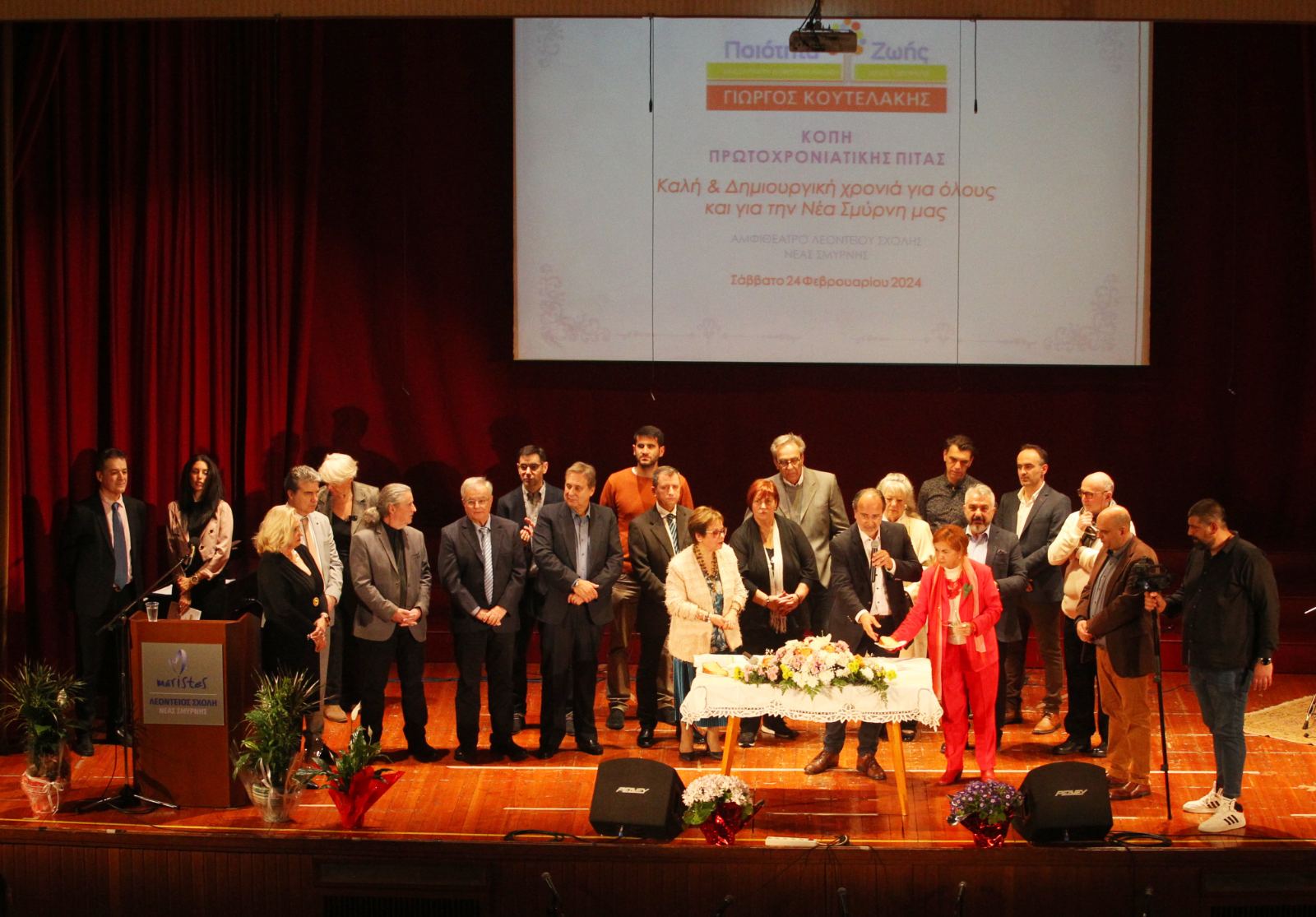 Στο κατάμεστο από κόσμο Αμφιθέατρο της Λεοντείου Σχολής, πραγματοποιήθηκε η κοπή πίτας της δημοτικής παράταξης «Νέα Σμύρνη Ποιότητας Ζωής» του Δημάρχου Γιώργου Κουτελάκη, το απόγευμα του Σαββάτου 24 Φεβρουαρίου.