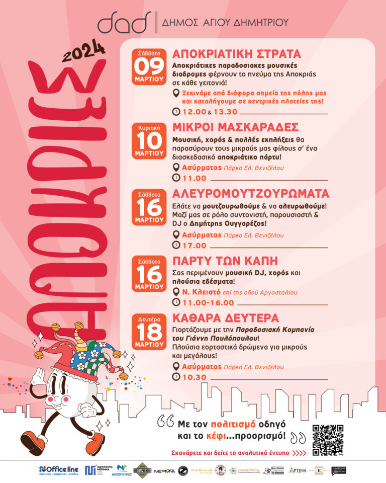 Ο Δήμος Αγίου Δημητρίου, με τη φροντίδα του Τμήματος Πολιτισμού, διοργανώνει ένα πλούσιο αποκριάτικο πρόγραμμα γεμάτο μουσικές, χορούς και παιχνίδια για όλες τις ηλικίες. Μικροί και μεγάλοι σε ένα απόλυτα μυσταγωγικό γλέντι που μας συνδέει με τις ρίζες μας, τα ήθη και τα έθιμα του τόπου μας. Ο Δήμαρχος του Δήμου Αγίου Δημητρίου, Στέλιος Μαμαλάκης απευθύνει πρόσκληση σε όλους τους πολίτες, δημότες και επισκέπτες για τη μεγάλη γιορτή: «Οργανώσαμε τις φετινές γιορτές με αγάπη, μεράκι και στόχο να έρθουμε πιο κοντά. Σας καλούμε όλους στη μεγάλη αποκριάτικη γιορτή του δήμου μας να ξεφαντώσουμε όλοι μαζί, να ζήσουμε στιγμές ξεγνοιασιάς». Η Αντιδήμαρχος Πολιτισμού, Αγγελική Σαραβελάκη, με αφορμή την επικείμενη αποκριάτικη γιορτή προσκαλεί μικρούς και μεγάλους να συμμετάσχουν: «Ελάτε να ζήσουμε μια μοναδική εμπειρία γεμάτη χρώματα, μουσική και χαμόγελα σε ένα πλούσιο πρόγραμμα δωρεάν εκδηλώσεων με πρωταγωνιστές τα παιδιά.»