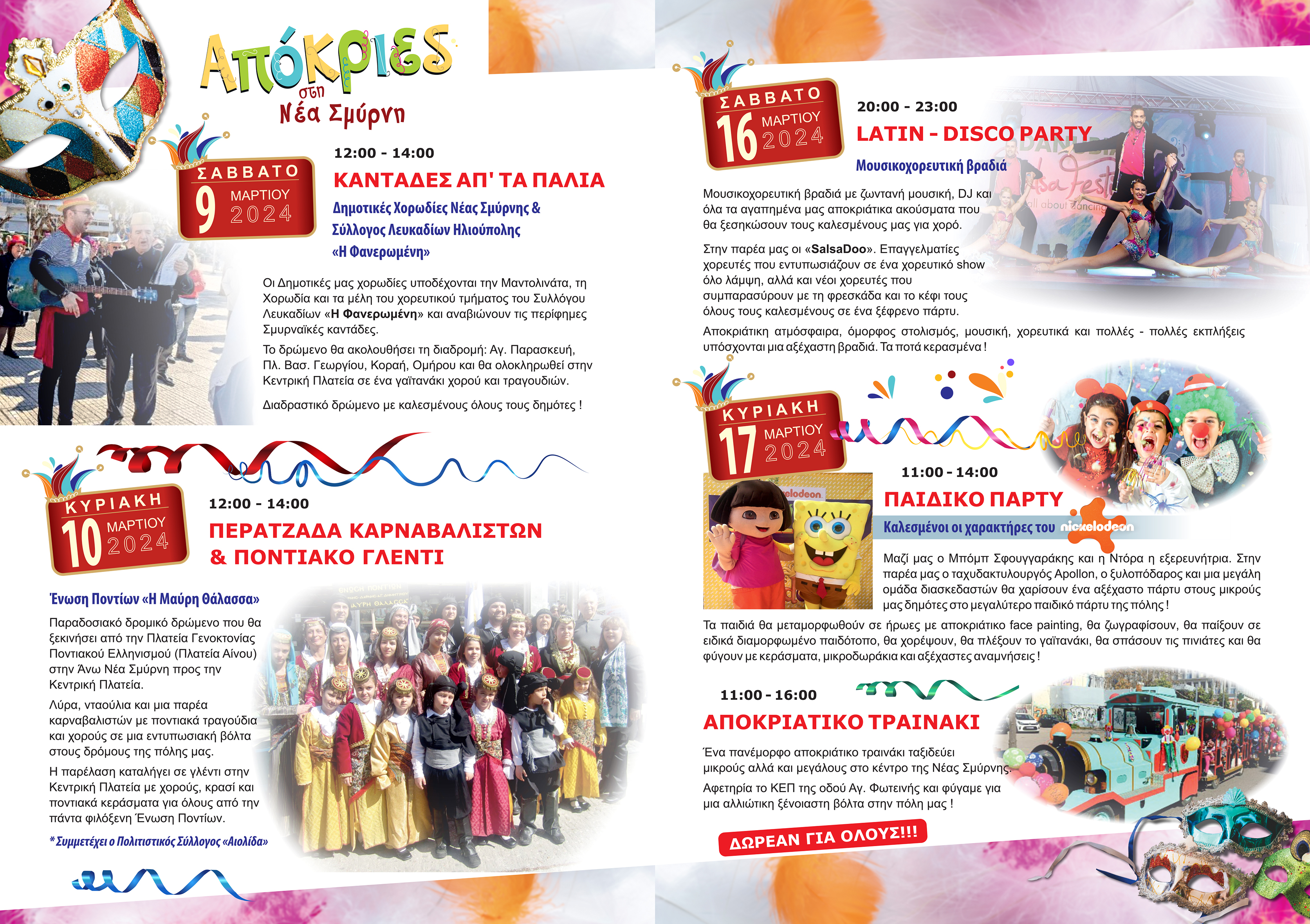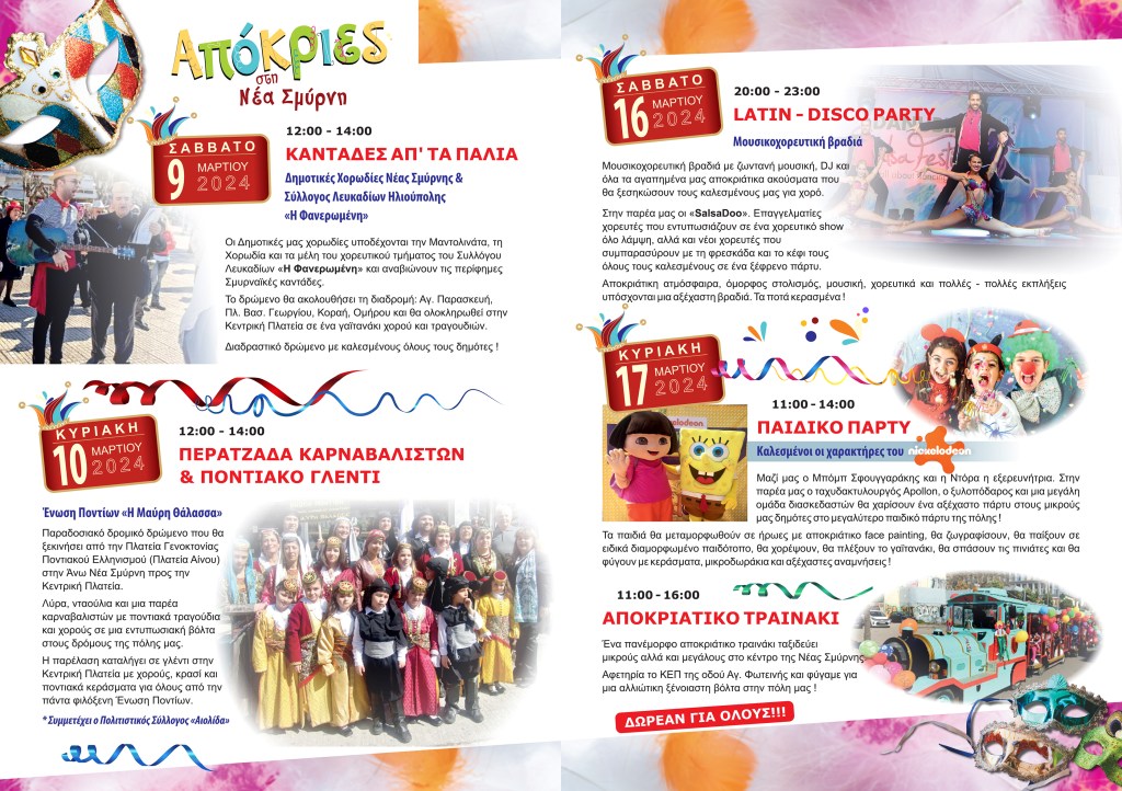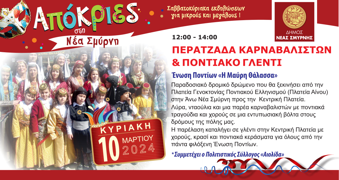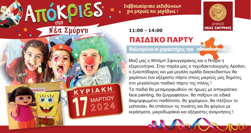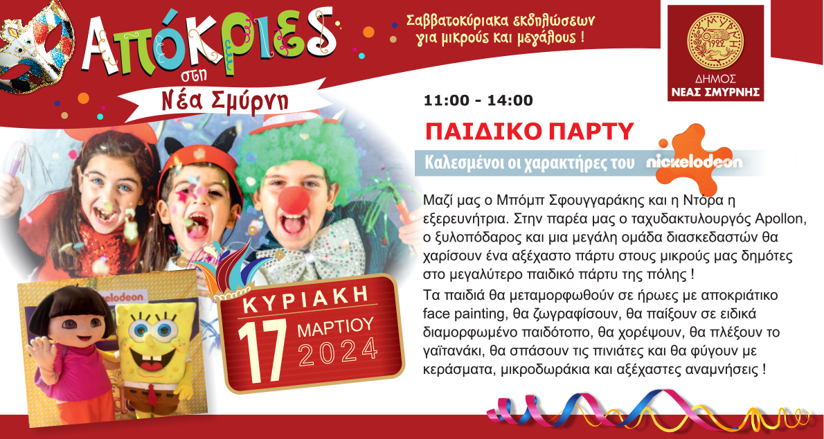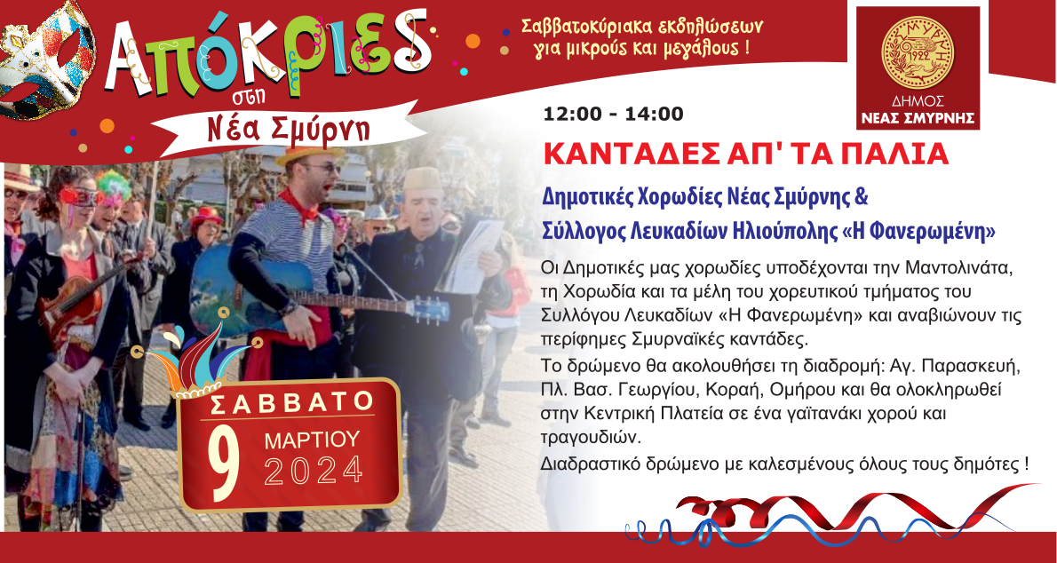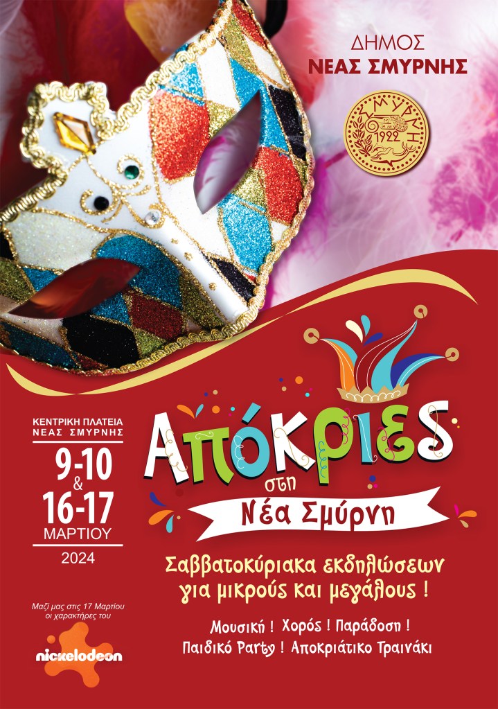 Για πρώτη φορά στη σύγχρονη ιστορία του, ο Δήμος Νέας Σμύρνης διοργανώνει αυτή την χρονιά Αποκριάτικες Εκδηλώσεις. Η νέα δημοτική Αρχή μάλιστα καλεί τους δημότες να δηλώσουν μέσω της συμμετοχής τους στις εκδηλώσεις την επιθυμία τους θα γίνει μόνιμος ο θεσμός με ακόμα πλουσιότερο πρόγραμμα κάθε χρόνο.