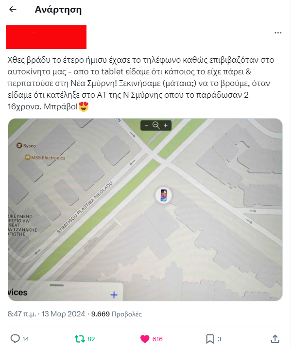 «Χθες βράδυ το έτερο ήμισυ έχασε το τηλέφωνο καθώς επιβιβαζόταν στο αυτοκίνητο μας – από το tablet είδαμε ότι κάποιος το είχε πάρει & περπατούσε στη Νέα Σμύρνη! Ξεκινήσαμε (μάταια;) να το βρούμε, όταν είδαμε ότι κατέληξε στο Α.Τ. της Ν. Σμύρνης όπου το παράδωσαν δύο 16χρονα. Μπράβο!» αναφέρει αρχικά και συνεχίζει: «Ήταν ένα αγόρι και ένα κορίτσι από τη Ν. Σμύρνη. Μιλάμε για καινούριο τηλέφωνο, και ξεκλείδωτο. Περπάτησαν 15 λεπτά για να πάνε στο Τμήμα. Χίλια μπράβο! Ντραπήκαμε να ζητήσουμε όνομα, τουλάχιστον να στέλναμε ένα μπράβο στους γονείς! Ήταν 11.50 το βράδυ και δεν ρώτησα τα στοιχεία τους, το μετάνιωσα.»
