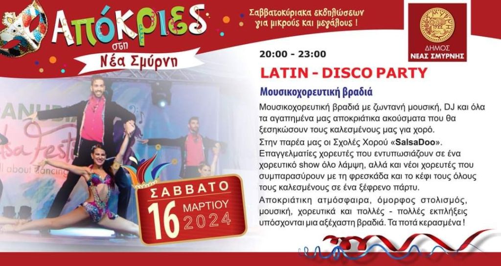 Το Σάββατο 16 Μαρτίου, στις 20:00 το βράδυ έχει προγραμματισθεί ένα μεγάλο Latin – Disco πάρτι στην Κεντρική Πλατεία της πόλης, στο οποίο θα υπάρχει DJ αλλά και ζωντανή μουσική.
